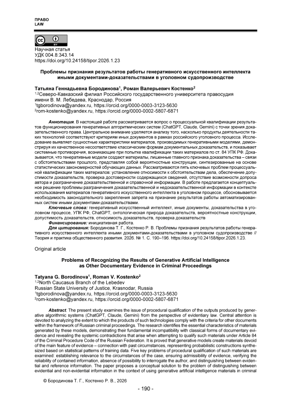 В настоящей работе рассматривается вопрос о процессуальной квалификации результатов функционирования генеративных алгоритмических систем (ChatGPT, Claude, Gemini) с точки зрения доказательственного права. Центральное внимание уделяется анализу того, насколько продукты деятельности таких технологий соответствуют критериям иных документов в рамках российского уголовного процесса. Исследование выявляет сущностные характеристики материалов, производимых генеративными моделями, демонстрируя их качественное несоответствие классическим формам документальных доказательств, и показывает системные противоречия, возникающие при попытке квалификации таких материалов по ст. 84 УПК РФ. Доказывается, что генеративные модели создают материалы, лишенные главного признака доказательства – связи с обстоятельствами прошлого, представляя собой вероятностные конструкции, синтезированные на основе статистических закономерностей обучающих данных. Рассматриваются пять ключевых проблем процессуальной квалификации таких материалов: установление относимости к обстоятельствам дела, обеспечение допустимости доказательств, проверка достоверности содержащихся сведений, отсутствие возможности допроса автора и разграничение доказательственной и справочной информации. В работе предлагается концептуальное решение проблемы разграничения доказательственной и недоказательственной информации в контексте использования материалов генеративного искусственного интеллекта в уголовном процессе, обосновывается необходимость законодательного закрепления запрета на признание результатов работы автоматизированных систем иными документами-доказательствами.