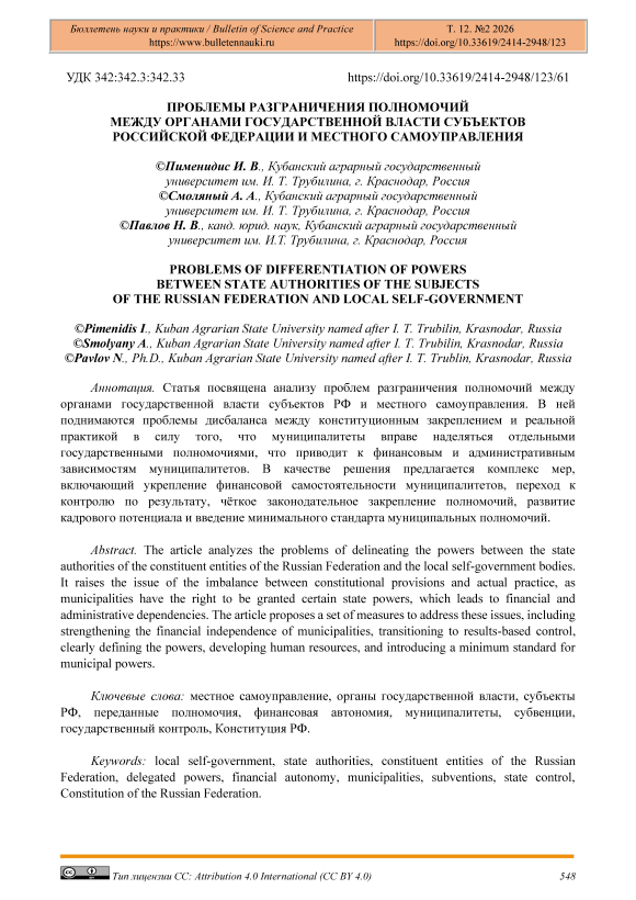Статья посвящена анализу проблем разграничения полномочий между органами государственной власти субъектов РФ и местного самоуправления. В ней поднимаются проблемы дисбаланса между конституционным закреплением и реальной практикой в силу того, что муниципалитеты вправе наделяться отдельными государственными полномочиями, что приводит к финансовым и административным зависимостям муниципалитетов. В качестве решения предлагается комплекс мер, включающий укрепление финансовой самостоятельности муниципалитетов, переход к контролю по результату, чёткое законодательное закрепление полномочий, развитие кадрового потенциала и введение минимального стандарта муниципальных полномочий.