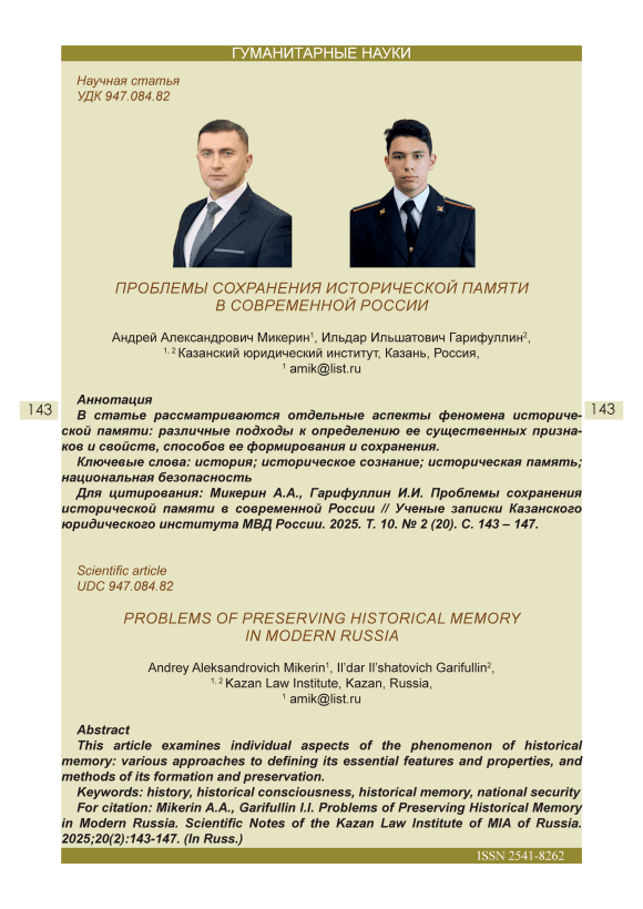 Сохранение исторической памяти – одна из важнейших задач, с которой сталкиваются как отдельные национальные сообщества, так и человечество в целом. В век глобализации, мультикультурности четко проявляется тенденция стирания национальных и культурных границ между странами, формирование общей идентичности. Зачастую это сопровождается вытеснением национальных традиционных ценностей, складывающихся на протяжении истории. Более того, заметны попытки контролировать этот процесс, управлять им в субъективных политических интересах, использовать в качестве средства ведения гибридных войн. В наши дни в средствах массовой информации, в заявлениях политиков, в выступлениях неофициальных лиц происходит трансформация, а иногда целенаправленное искажение 144 исторического прошлого. Объектом подобных нападок выступает общая память о национальной истории, транслируемая на протяжении многих поколений. Это грозит разрушением общенациональной идентичности, дезинтегрирует и дестабилизирует общество.