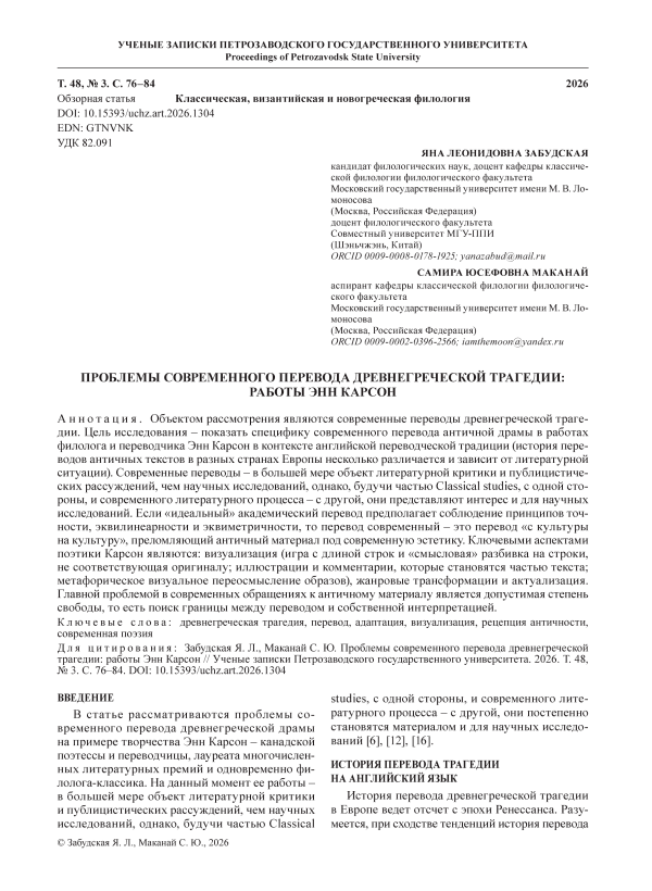 The object of research is the modern translations of ancient Greek tragedy. The aim is to explore the specifics of modern translations of ancient drama by a Canadian linguist and translator Anne Carson in the context of the English translation tradition (as the history of translating ancient texts in different European countries varies depending on their own literary traditions). Modern translations are more of an object of literary criticism and publicistic reflection rather than of scholarly research. However, being part of classical studies, on the one hand, and the modern literary process, on the other, they are also of special interest for researchers. While an “ideal” academic translation implies strict adherence to the principles of accuracy, equilinearity, and equimetry, a modern translation is a translation “from culture to culture” refracting ancient material in accordance with modern aesthetics. The key aspects of Carson’s poetics are visualization (playing with the length of lines and “semantic” breakdown into lines that do not correspond to the original; illustrations and comments that become part of the text; metaphorical visual reinterpretation of images), genre transformations, and actualization. The main problem in modern references to ancient material is identifying the permissible degree of freedom and the search for boundaries between translation and one’s own interpretation.
