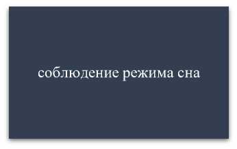 Важное значение имеет регулярная умеренная физическая активность - это ходьба пешком, велосипедные прогулки, занятия в бассейне т.д.; соблюдение режима сна, т.к. сон – защитный механизм организма, дающий возможность восстановить работоспособность.