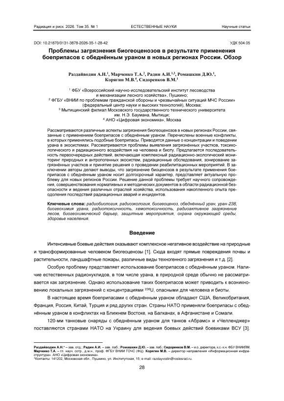 Рассматриваются различные аспекты загрязнения биогеоценозов в новых регионах России, связанные с применением боеприпасов с обеднённым ураном. Перечислены военные конфликты, в которых применялись подобные боеприпасы. Приводятся данные о концентрации и поведении урана в экосистемах. Рассматриваются проблемы выявления загрязнённых участков, токсикологического и радиационного воздействия на человека и биоту. Предлагается последовательность первоочередных действий, включающая комплексный радиационноэкологический мониторинг природных и антропогенных экосистем, радиационные обследования, зонирование загрязнённых участков и принятие решения о проведении реабилитационных мероприятий. В заключении авторы делают выводы, что загрязнение биоценозов в результате применения боеприпасов с обеднённым ураном носит долгосрочный характер, представляет актуальную проблему для новых регионов России. Решение данной проблемы требует научного сопровождения, совершенствования нормативных и методических документов в области радиационной безопасности и ведения различных отраслей хозяйства, использования накопленного опыта преодоления последствий радиационных аварий и инцидентов.