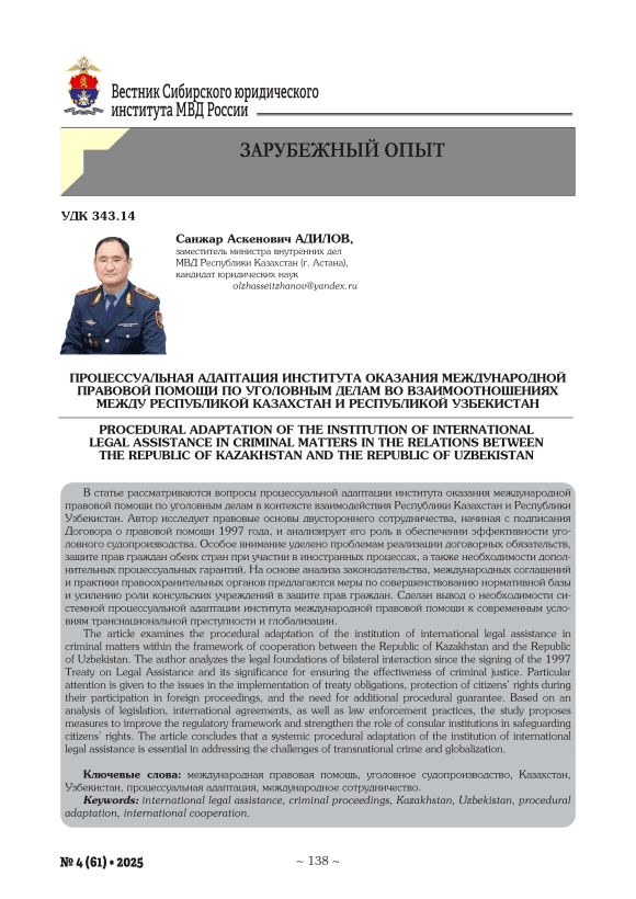 Процессуальная адаптация института оказания международной правовой помощи по уголовным делам во взаимоотношениях между Республикой Казахстан и Республикой Узбекистан