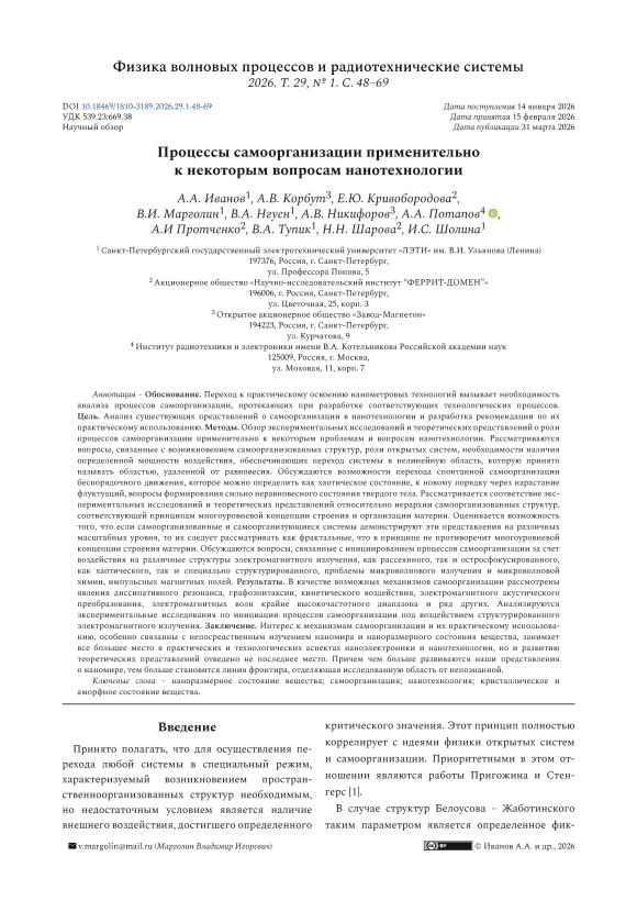 Обоснование. Переход к практическому освоению нанометровых технологий вызывает необходимость анализа процессов самоорганизации, протекающих при разработке соответствующих технологических процессов. Цель. Анализ существующих представлений о самоорганизации в нанотехнологии и разработка рекомендации по их практическому использованию. Методы. Обзор экспериментальных исследований и теоретических представлений о роли процессов самоорганизации применительно к некоторым проблемам и вопросам нанотехнологии. Рассматриваются вопросы, связанные с возникновением самоорганизованных структур, роли открытых систем, необходимости наличия определенной мощности воздействия, обеспечивающих переход системы в нелинейную область, которую принято называть областью, удаленной от равновесия. Обсуждаются возможности перехода спонтанной самоорганизации беспорядочного движения, которое можно определить как хаотическое состояние, к новому порядку через нарастание флуктуаций, вопросы формирования сильно неравновесного состояния твердого тела. Рассматривается соответствие экспериментальных исследований и теоретических представлений относительно иерархии самоорганизованных структур, соответствующей принципам многоуровневой концепции строения и организации материи. Оценивается возможность того, что если самоорганизованные и самоорганизующиеся системы демонстрируют эти представления на различных масштабных уровня, то их следует рассматривать как фрактальные, что в принципе не противоречит многоуровневой концепции строения материи. Обсуждаются вопросы, связанные с инициированием процессов самоорганизации за счет воздействия на различные структуры электромагнитного излучения, как рассеянного, так и остросфокусированного, как хаотического, так и специально структурированного, проблемы микроволнового излучения и микроволновой химии, импульсных магнитных полей. Результаты. В качестве возможных механизмов самоорганизации рассмотрены явления диссипативного резонанса, графоэпитаксии, кинетического воздействия, электромагнитного акустического преобразования, электромагнитных волн крайне высокочастотного диапазона и ряд других. Анализируются экспериментальные исследования по инициации процессов самоорганизации под воздействием структурированного электромагнитного излучения. Заключение. Интерес к механизмам самоорганизации и их практическому использованию, особенно связанны с непосредственным изучением наномира и наноразмерного состояния вещества, занимает все большее место в практических и технологических аспектах наноэлектроники и нанотехнологии, но и развитию теоретических представлений отведено не последнее место. Причем чем больше развиваются наши представления о наномире, тем больше становится линия фронтира, отделяющая исследованную область от непознанной.