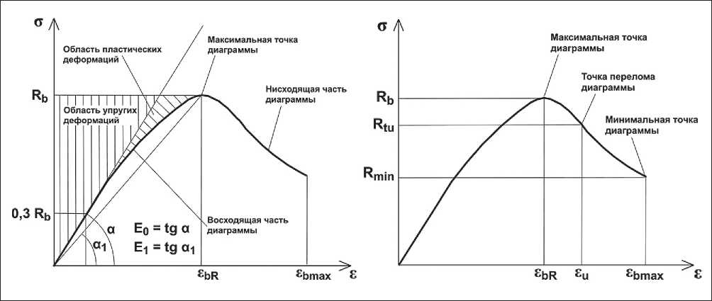 Общий вид и основные параметрические точки диаграммы деформирования σ–ε бетона при сжатии приведены на рис. 1.