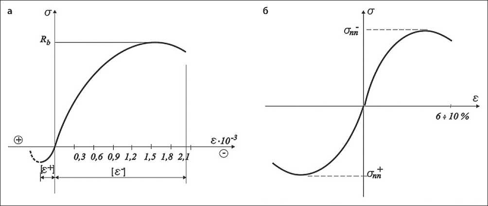 При этом на диаграмме обнаруживается нисходящий участок. При выборе и построении аппроксимирующих зависимостей воспользуемся понятиями предельной сжимаемости [ε–] и предельной растяжимости бетона [ε+], т.е. деформациями бетона в момент разрушения. Для расчета при так называемом кратковременном нагружении можно принять предельную сжимаемость [ε–] ≈ 2,0·10–3, предельную растяжимость при осевом растяжении [ε+] ≈ (1,5÷3)·10–4), при изгибе и внецентренном сжатии [ε–] ≈ 3,5·10–3. Предельная растяжимость при изгибе существенно выше и краевые удлинения в этом
