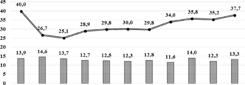 К факторам, усиливающим напряжённость в сфере уровня жизни, относятся возросшие в последние годы темпы роста потребительских цен и курс рубля к доллару США. В частности, в 2024 г. сводный индекс цен на продовольственном рынке составил 111,1% и был выше, чем в предыдущие годы15, а курс рубля к доллару США в среднегодовом значении достиг 92,44 руб.16 В этих условиях у домохозяйств расходы на потребление в 2023/2021 гг. увеличились в среднем на члена домохозяйства на 27,1% при росте на 23,8% по рас- полагаемым ресурсам17, что является признаком снижения их уровня жизни.