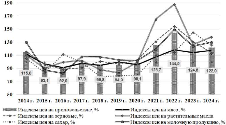 тывает цены на мясо, молочную продукцию, зерновые, растительные масла, сахар) в 2021–2024 гг. находился в диапазоне 122,0–144,4%, в том числе на мясо 107,5–118,3%, молочные продукты 119,6– 149,5%, растительные масла 126,3–187,8%, зерновые 113,5–154,7%, сахар 109,3–145,0%. В 2024 г. отмечается понижение сводного индекса цен (-2,5 п.п.), что было обусловлено снижением индексов цен на зерновые и на сахар при одновременном росте индексов цен на мясо, растительные масла, молочную продукцию.