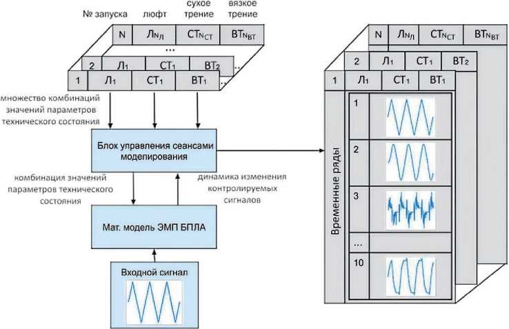 На первом этапе применяется математическая модель ЭМП для отработки в рамках множества сеансов моделирования стационарного управляющего сигнала с заданными амплитудой и частотой. ТС привода определяются комбинациями значений, не наблюдаемых при мониторинге параметров ТС, в частности люфта (Л), сухого трения (СТ), вязкого трения (ВТ). В результате моделирования формируются временные ряды из значений контролируемых сигналов.