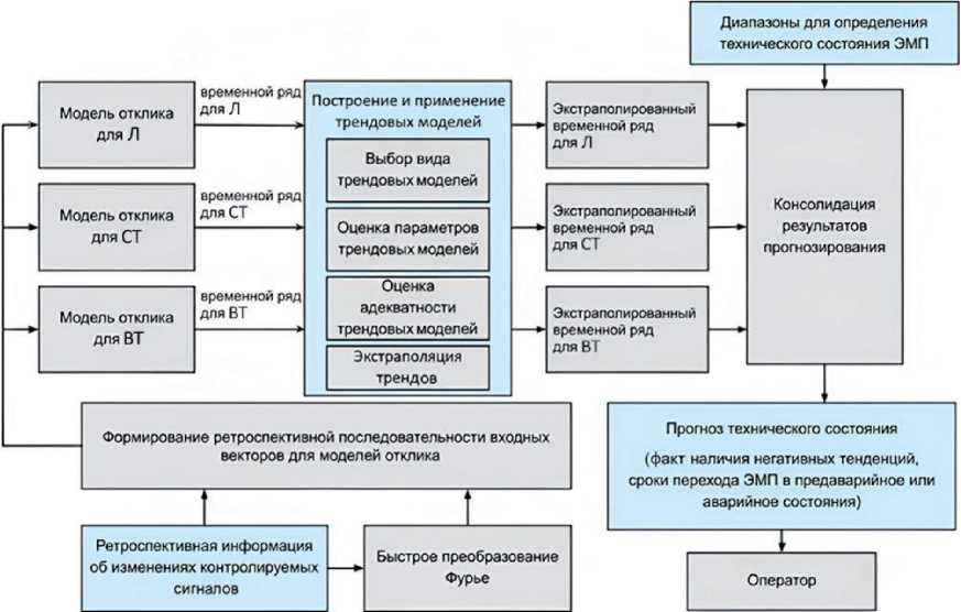 На третьем этапе созданные модели отклика интегрируются с методами построения трендовых моделей (см. рисунок 4). Результатом применения моделей отклика к ретроспективным последовательностям входных векторов, включающих ДП, являются временные ряды для параметров ТС, которые экстраполируются на основе трендовых моделей. Результаты экстраполяции используются для создания диагностической информации. Таким образом, формируется проект единого алгоритма прогнозирования ТС ЭМП, который может быть реализован на языках программирования со специализированными математическими библиотеками.