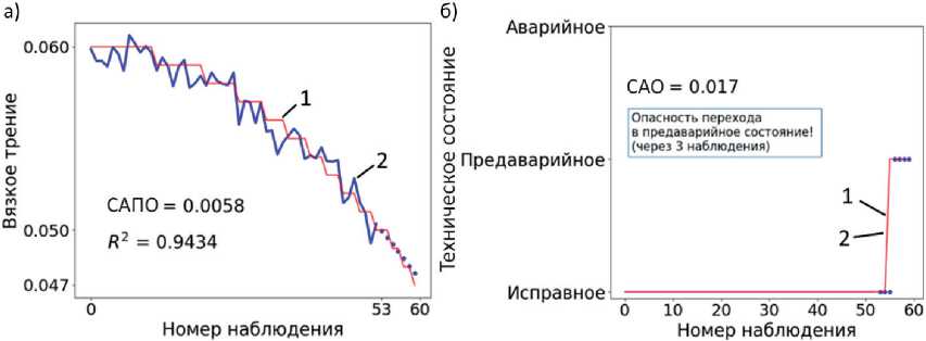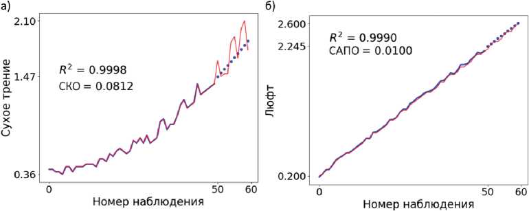 Рисунок 5 – Примеры применения трендовых моделей для прогнозирования сухого трения (а) и люфта (б)