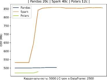 Рисунок 2. Время выполнение задачи и потребление ресурсов на Pandas, Spark и Polars для 2500 записей на студента