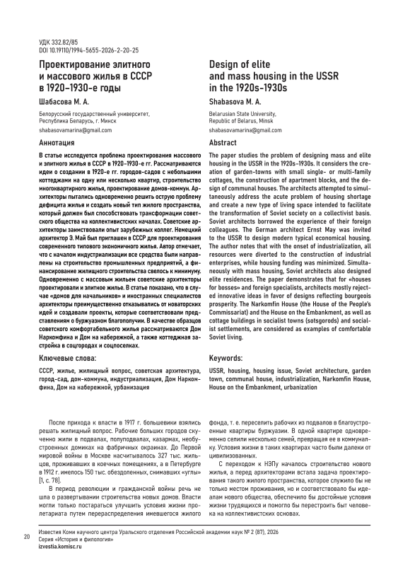 В статье исследуется проблема проектирования массового и элитного жилья в СССР в 1920–1930-е гг. Рассматриваются идеи о создании в 1920-е гг. городов-садов с небольшими коттеджами на одну или несколько квартир, строительство многоквартирного жилья, проектирование домов-коммун. Архитекторы пытались одновременно решить острую проблему дефицита жилья и создать новый тип жилого пространства, который должен был способствовать трансформации советского общества на коллективистских началах. Советские архитекторы заимствовали опыт зарубежных коллег. Немецкий архитектор Э. Май был приглашен в СССР для проектирования современного типового экономичного жилья. Автор отмечает, что с началом индустриализации все средства были направлены на строительство промышленных предприятий, а финансирование жилищного строительства свелось к минимуму. Одновременно с массовым жильем советские архитекторы проектировали и элитное жилье. В статье показано, что в случае «домов для начальников» и иностранных специалистов архитекторы преимущественно отказывались от новаторских идей и создавали проекты, которые соответствовали представлениям о буржуазном благополучии. В качестве образцов советского комфортабельного жилья рассматриваются Дом Наркомфина и Дом на набережной, а также коттеджная застройка в соцгородах и соцпоселках.