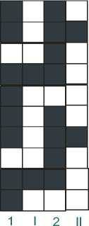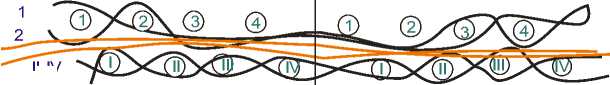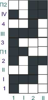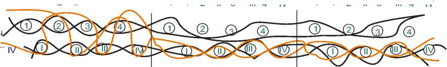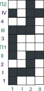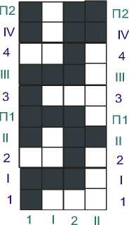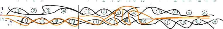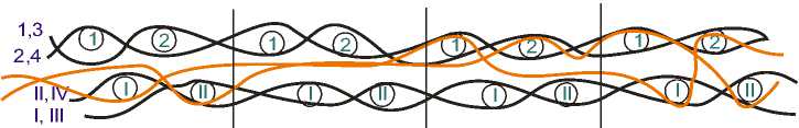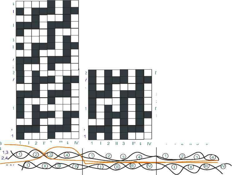 Переплетение 8 построено на базе полотна в верхнем и нижнем слоях, цветной рисунок образуется с нитями прижимного узорообразующего утка, перплета-ющимися по мотиву рогожки 2/2 с нитями основы верхнего слоя; девятое и десятое построены с применением правой и левой саржи 3/1 в верхнем слое, нижний слой – полотно, прижимной узорообразующий уток располагается прямолинейно без переплетения между слоями.