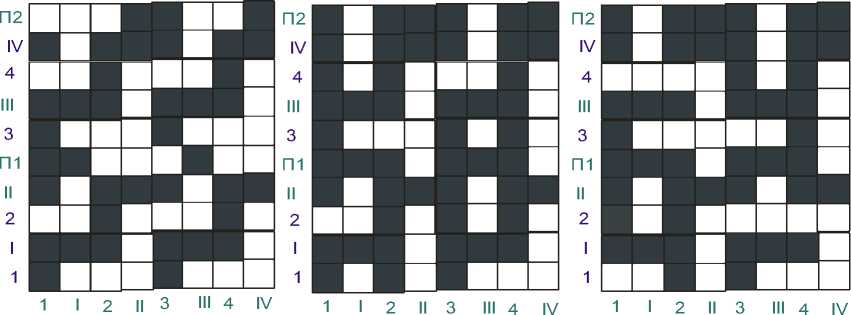 Рисунок 4 – Модельные переплетения № 11, 12, 13 для выработки жаккардовой двухсторонней ткани Figure 4 – Model weaves No. 11, 12, 13 for the production of double-sided jacquard fabric