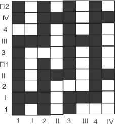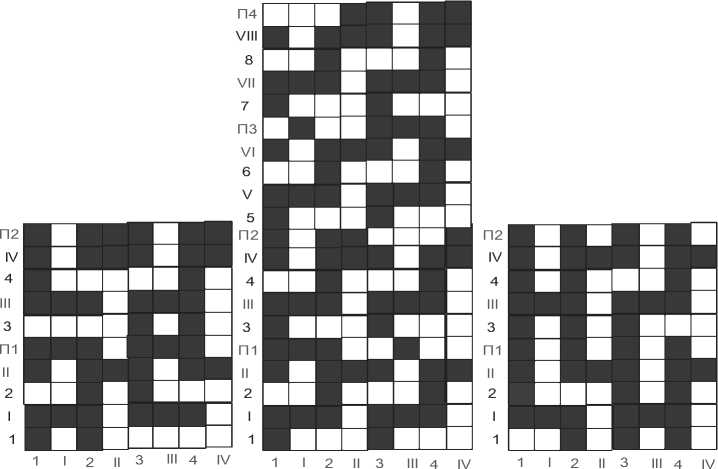 Рисунок 1 – Модельные переплетения № 1, 2, 3, 4 для выработки жаккардовой двухсторонней ткани Figure 1 – Model weaves No. 1, 2, 3, 4 for producing double-sided jacquard fabric