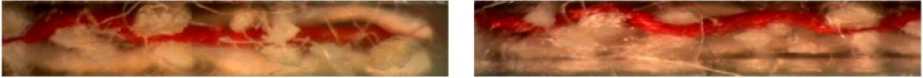 Рисунок 10 – Продольный разрез фрагмента двухслойной ткани с красным прижимным утком Figure 10 – Longitudinal section of a fragment of double-layer fabric with red pressing weft