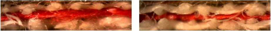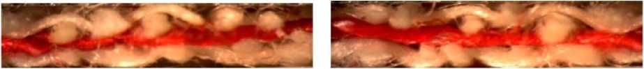 Фрагменты рисунка на различных участках раппорта были проанализированы по методу срезов. Фактическое расположение нитей в ткани нового вида представлено на фотографиях срезов (рисунки 8 и 9).