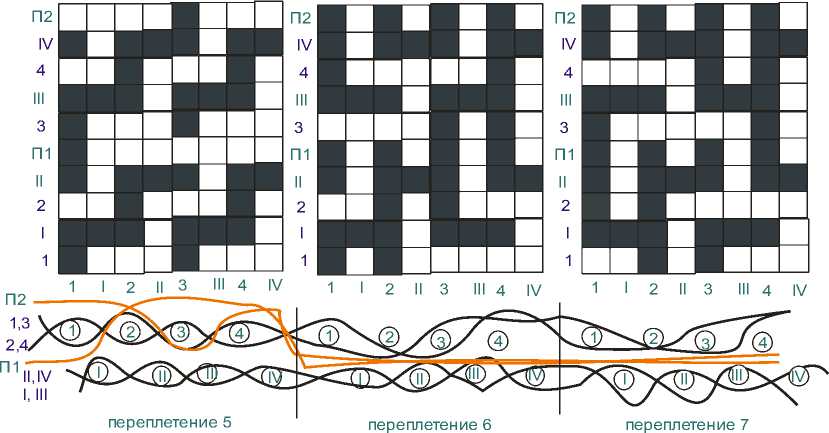 На рисунке 2 переплетение 5 построено при помощи полотняного переплетения в верхнем и нижнем слоях, цветной рисунок создаётся длинными трёхосновными настилами прижимного утка (П1, П2), расположенными только в верхнем слое в шахматном порядке; шестое и седьмое построены с использованием в верхнем слое правой и левой саржи 2/2, в нижнем полотна без участия прижимного узорообразующего утка в формировании рисунка обеих сторон.