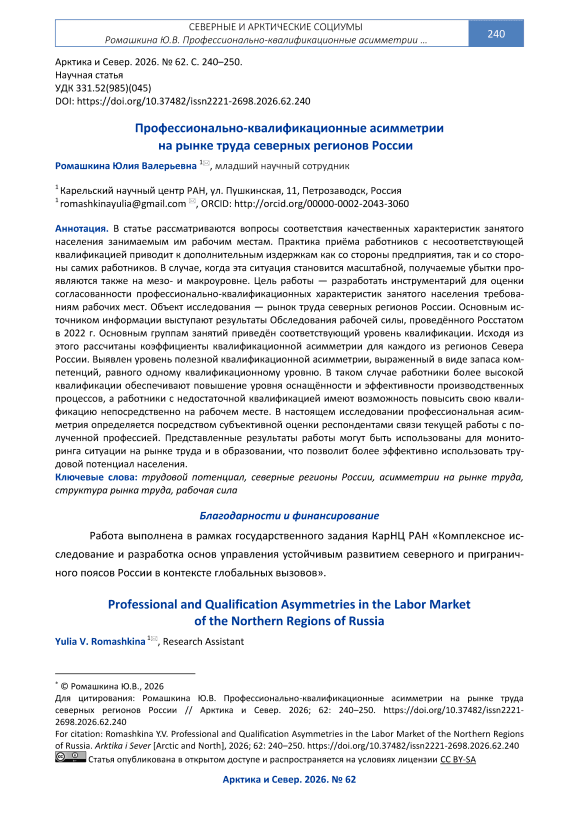 The article examines issues related to the correspondence between the qualitative characteristics of the employed population and their jobs. The practice of hiring workers with inadequate qualifications leads to additional costs for both the enterprise and the workers themselves. When this situation becomes widespread, the resulting losses are also felt at the meso- and macrolevels. The aim of this work is to develop tools for assessing the consistency of the professional and qualification characteristics of the employed population with the requirements of jobs. The object of the study is the labor market in the northern regions of Russia. The main source of information is the results of the Labor Force Survey conducted by Rosstat in 2022. The main occupational groups are assigned a corresponding level of qualification. Based on this, qualification asymmetry coefficients are calculated for each of the regions of northern Russia. The level of useful qualification asymmetry has been identified, expressed as a stock of competencies equal to one qualification level. In this case, more highly qualified workers ensure an increase in the level of equipment and efficiency of production processes, while workers with insufficient qualifications have the opportunity to improve their qualifications directly in the workplace. In this study, professional asymmetry is determined by respondents’ subjective assessment of the connection between their current job and their profession. The results presented can be used to monitor the situation in the labor market and education, which will allow for more effective use of the labor potential of the population.