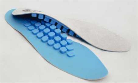 Все пловцы были разделены на две группы – экспериментальную и контрольную (по 12 человек в каждой). В течение годичного цикла тренировочного процесса контрольная группа занималась по стандартной тренировочной методике. Экспериментальная группа тренировалась по такой же методике, однако с внедрением общеукрепляющих упражнений: круговые вращения стопой и пальцами ног, переходы с пятки на носок, сгибание и разги- бание пальцев сидя на полу, подъем на носки стоя, передвижение вперед в положении стоя с помощью сгибания пальцев ног, прокатывание теннисного мяча стопой, массажа: растирание и разминание мышц поясничного отдела и ягодиц, далее расслабление мышц голени, затем выполнялся точечный массаж с помощью массажера Trigger pyramid по вертикальной линии от голени и вниз к стопам (каждой точке уделялось не менее 60 секунд), а также с использованием индивидуальных ортопедических стелек KINEZIOSTEP (см. рисунок).