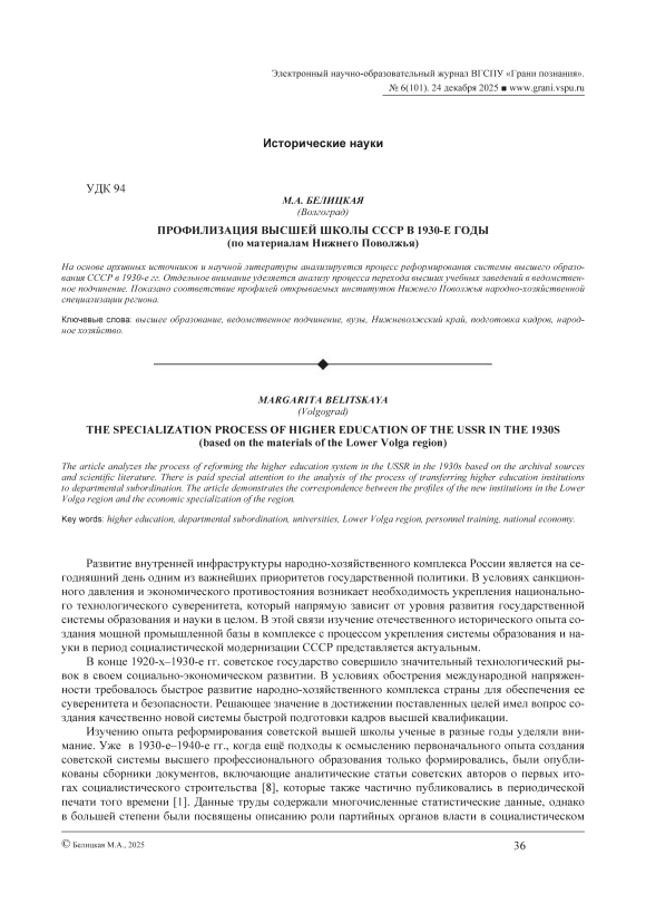 На основе архивных источников и научной литературы анализируется процесс реформирования системы высшего образования СССР в 1930-е гг. Отдельное внимание уделяется анализу процесса перехода высших учебных заведений в ведомственное подчинение. Показано соответствие профилей открываемых институтов Нижнего Поволжья народно-хозяйственной специализации региона.