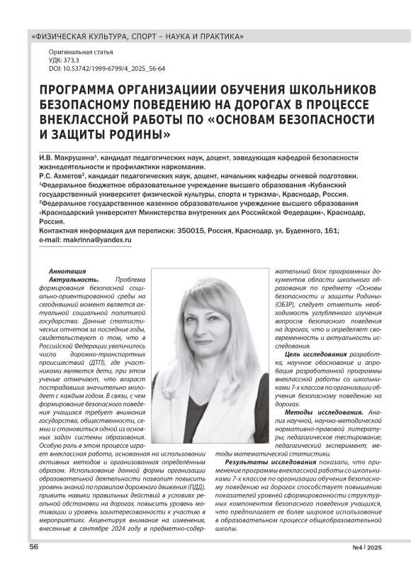 Актуальность. Проблема формирования безопасной социально-ориентированной среды на сегодняшний момент является актуальной социальной политикой государства. Данные статистических отчетов за последние годы, свидетельствуют о том, что в Российской Федерации увеличилось число дорожно-транспортных происшествий (ДТП), где участниками являются дети, при этом ученые отмечают, что возраст пострадавших значительно молодеет с каждым годом. В связи, с чем формирование безопасного поведения учащихся требует внимания государства, общественности, семьи и становиться одной из основных задач системы образования. Особую роль в этом процессе играет внеклассная работа, основанная на использовании активных методов и организованная определённым образом. Использование данной формы организации образовательной деятельности позволит повысить уровень знаний по правилам дорожного движения (ПДД), привить навыки правильных действий в условиях реальной обстановки на дорогах, повысить уровень мотивации и уровень заинтересованности к участию в мероприятиях. Акцентируя внимание на изменения, внесенные в сентябре 2024 году в предметно-содержательный блок программных документов области школьного образования по предмету «Основы безопасности и защиты Родины» (ОБЗР), следует отметить необходимость углубленного изучения вопросов безопасного поведения на дорогах, что и определяет своевременность и актуальность исследования. Цель исследования разработка, научное обоснование и апробация разработанной программы внеклассной работы со школьниками 7-х классов по организации обучения безопасному поведению на дорогах. Методы исследования. Анализ научной, научно-методической нормативно-правовой литературы; педагогическое тестирование; педагогический эксперимент; методы математической статистики. Результаты исследования показали, что применение программы внеклассной работы со школьниками 7-х классов по организации обучения безопасному поведению на дорогах способствует повышению показателей уровней сформированности структурных компонентов безопасного поведения учащихся, что предполагает ее более широкое использование в образовательном процессе общеобразовательной школы. Заключение. Таким образом, внедрение разработанной программы внеклассной работы по организации обучения безопасному поведению на дорогах школьников 7-х классов способствует формированию высоких уровней структурных компонентов безопасного поведения учащихся и способствует формированию культуры безопасности жизнедеятельности личности в целом.