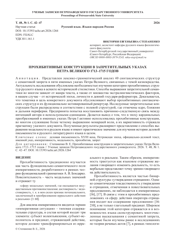 Представлен лексико-грамматический анализ 40 синтаксических структур с семантикой запрета в пяти именных указах Петра Великого, связанных с темой казнокрадства. Актуальность исследования обусловлена необходимостью изучения категории прохибитивных структур русского языка в аспекте исторической стилистики. Способы выражения запретительной семантики во многом зависят от жанра текста, а также от множества экстралингвистических факторов, в нашем случае – от исторической эпохи, личности и деяний государя-реформатора. Доказывается, что тематика и цель конкретного документа обусловливают выбор прохибитивных синтаксических структур и их функционально мотивированный репертуар. Исследуемые запретительные конструкции были распределены в соответствии с полевой структурой, где отмечены ядро, ближняя и дальняя периферии. Предпринята попытка восстановить причинно-следственную связь между интенцией автора и используемыми единицами. Делается вывод о том, что в эпоху кардинальных преобразований в именных указах Петра I активно использовались прохибитивные конструкции, во многом служившие более четкому выражению монаршей воли, а их вариативность отражала прагматику указного документа. Полученные результаты расширяют представление о способах выражения модальности в русском языке и имеют практическое значение для изучения истории деловой письменности и русского литературного языка в целом.