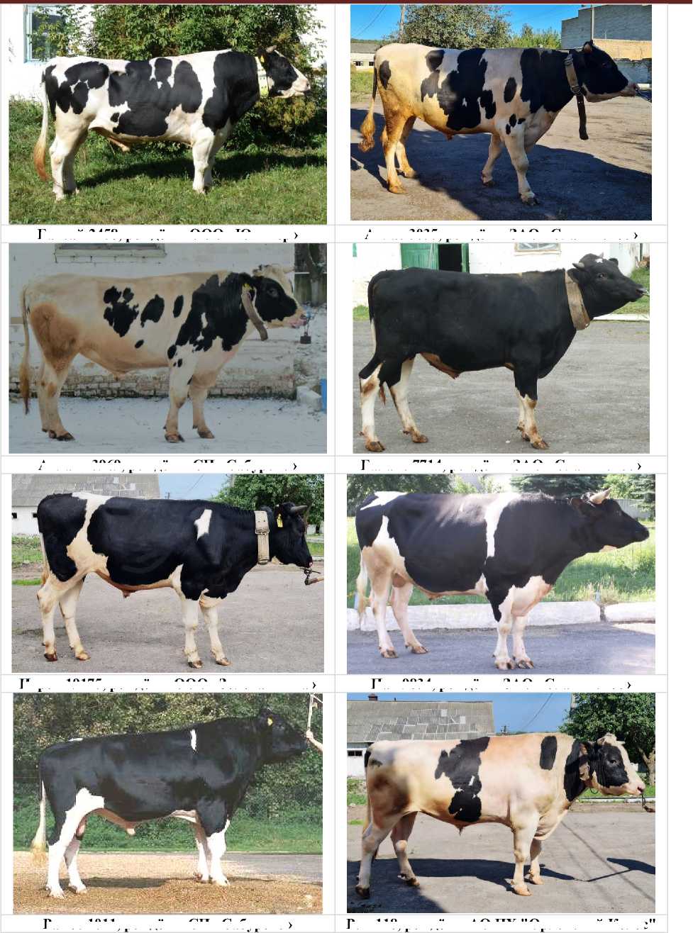 На рис. 3 представлены отдельные быки-производители, рождённые в разных стадах Орловской области и ООО «Золотая нива» Смоленской области, семя которых в настоящее время предлагает для реализации АО Подсобное хозяйство "Орловский Колос". Фотографии быков-производителей наглядно показывают их отличие по экстерьерноконституциональным особенностям, в т.ч. у них прослеживаются отличия по масти, т.е. по соотношению чёрного и белого цвета. Это в т.ч. подчёркивает наряду с родословными их разнообразие по происхождению и продуктивным особенностям.