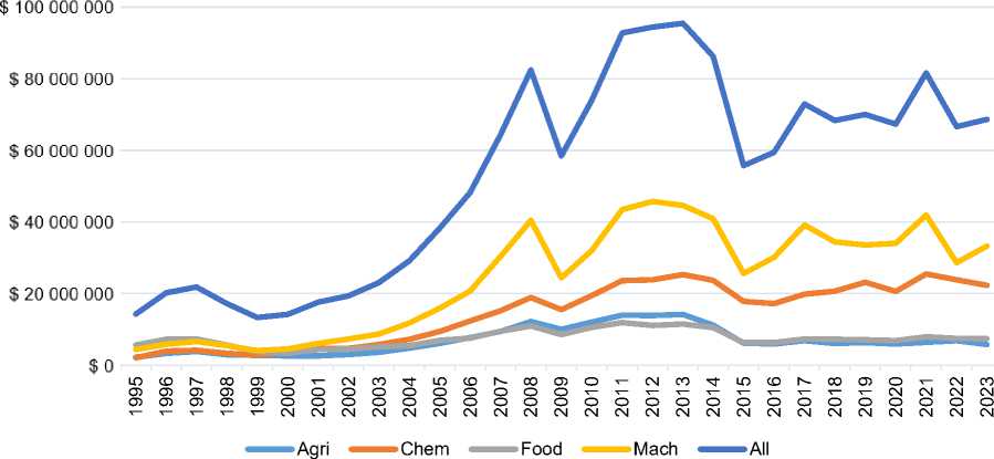 Наиболее значимая роль в структуре импорта принадлежит группе Mach, отражающей технологическое обеспечение сельского хозяйства. Доля Mach в совокупном импорте All в 2021 г. составляла 51,3 %, что подчеркивает высокую зависимость ресурсной базы от каналов поставок оборудования и технологических элементов. В 2022 г. на фоне ужесточения ограничений происходит резкое сокращение импорта техники с 41,9 млн долларов в 2021 г. до 28,6 млн долларов в 2022 г. В 2023 г. фиксируется частичное восстановление до 33,3 млн долларов, однако уровень 2021 г. не достигается.