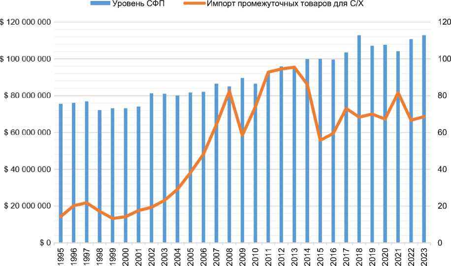 Рис. 2 . Динамика СФП и импорта промежуточных товаров для сельского хозяйства с 1995 по 2023 г.1