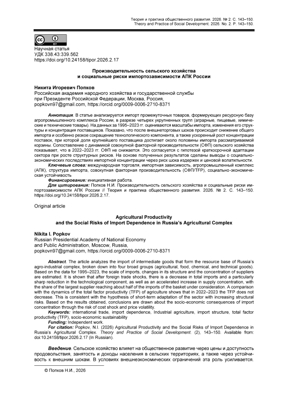 В статье анализируется импорт промежуточных товаров, формирующих ресурсную базу агропромышленного комплекса России, в разрезе четырех укрупненных групп (аграрные, пищевые, химические и технические товары). На данных за 1995–2023 гг. оцениваются масштабы импорта, изменения его структуры и концентрация поставщиков. Показано, что после внешнеторговых шоков происходит снижение общего импорта и особенно резкое сокращение технологического компонента, а также ускоренный рост концентрации поставок, при которой доля крупнейшего поставщика достигает около половины импорта рассматриваемой корзины. Сопоставление с динамикой совокупной факторной производительности (СФП) сельского хозяйства показывает, что в 2022–2023 гг. СФП не снижается. Это согласуется с гипотезой краткосрочной адаптации сектора при росте структурных рисков. На основе полученных результатов сделаны выводы о социально-экономических последствиях импортной концентрации через риск шока издержек и ценовой волатильности.