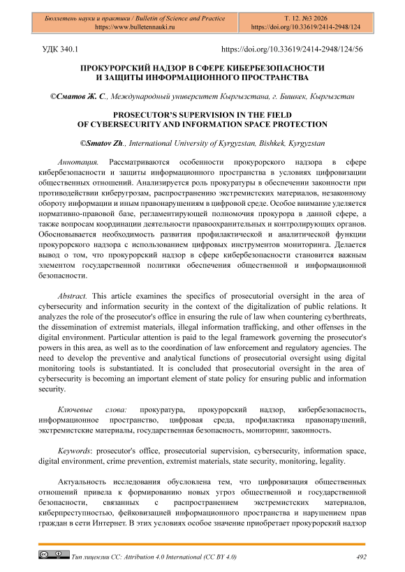 Рассматриваются особенности прокурорского надзора в сфере кибербезопасности и защиты информационного пространства в условиях цифровизации общественных отношений. Анализируется роль прокуратуры в обеспечении законности при противодействии киберугрозам, распространению экстремистских материалов, незаконному обороту информации и иным правонарушениям в цифровой среде. Особое внимание уделяется нормативно-правовой базе, регламентирующей полномочия прокурора в данной сфере, а также вопросам координации деятельности правоохранительных и контролирующих органов. Обосновывается необходимость развития профилактической и аналитической функции прокурорского надзора с использованием цифровых инструментов мониторинга. Делается вывод о том, что прокурорский надзор в сфере кибербезопасности становится важным элементом государственной политики обеспечения общественной и информационной безопасности.