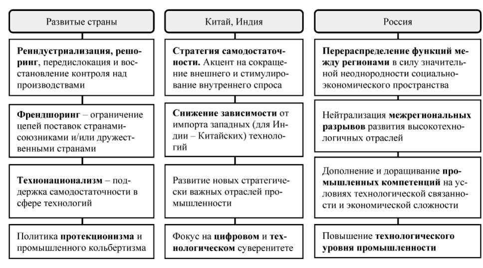 Таким образом, каждая страна для достижения технологического суверенитета в промышленности конкретизирует цели, разрабатывает принципы и инструментарий промышленной политики. Очевидным являются действия по возрождению промышленности, усилению ее независимости, контролю над иностранными инвестициями и стратегическим секторами.