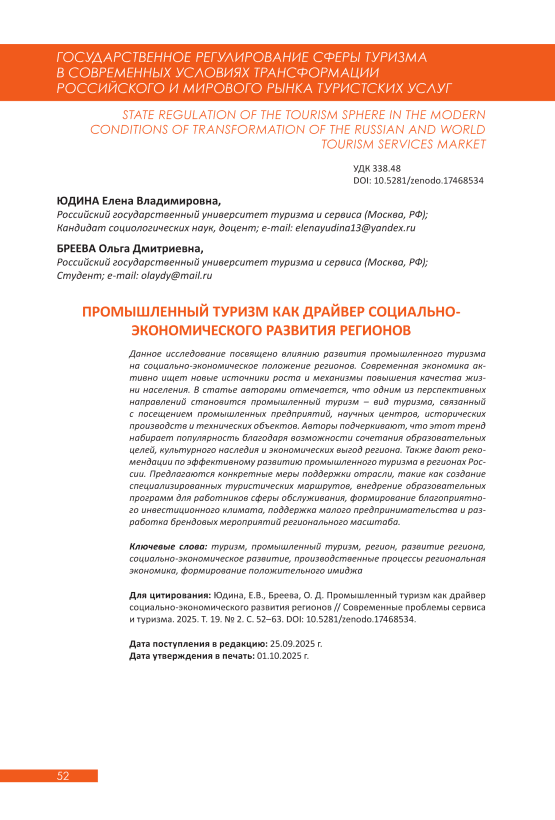 Данное исследование посвящено влиянию развития промышленного туризма на социальноэкономическое положение регионов. Современная экономика активно ищет новые источники роста и механизмы повышения качества жизни населения. В статье авторами отмечается, что одним из перспективных направлений становится промышленный туризм – вид туризма, связанный с посещением промышленных предприятий, научных центров, исторических производств и технических объектов. Авторы подчеркивают, что этот тренд набирает популярность благодаря возможности сочетания образовательных целей, культурного наследия и экономических выгод региона. Также дают рекомендации по эффективному развитию промышленного туризма в регионах России. Предлагаются конкретные меры поддержки отрасли, такие как создание специализированных туристических маршрутов, внедрение образовательных программ для работников сферы обслуживания, формирование благоприятного инвестиционного климата, поддержка малого предпринимательства и разработка брендовых мероприятий регионального масштаба.