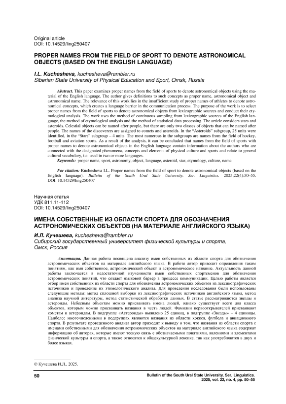 This paper examines proper names from the field of sports to denote astronomical objects using the ma-terial of the English language. The author gives definitions to such concepts as proper name, astronomical object and astronomical name. The relevance of this work lies in the insufficient study of proper names of athletes to denote astro-nomical concepts, which creates a language barrier in the communication process. The purpose of the work is to select proper names from the field of sports to denote astronomical objects from lexicographic sources and conduct their ety-mological analysis. The work uses the method of continuous sampling from lexicographic sources of the English lan-guage, the method of etymological analysis and the method of statistical data processing. The article considers stars and asteroids. Celestial objects can be named after people, but there are only two classes of objects that can be named after people. The names of the discoverers are assigned to comets and asteroids. In the “Asteroids” subgroup, 25 units were identified, in the “Stars” subgroup – 4 units. The most numerous in the subgroups are names from the field of hockey, football and aviation sports. As a result of the analysis, it can be concluded that names from the field of sports with proper names to denote astronomical objects in the English language contain information about the authors who are connected with the designated phenomena, concepts and elements of physical culture and sports and relate to general cultural vocabulary, i.e. used in two or more languages.