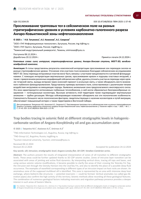 В статье представлены результаты комплексной интерпретации прослеживания зон переходов силлов на разные стратиграфические уровни. Уточнение этих участков стало возможно благодаря сейсмическим исследованиям МОГТ-3D. Зоны перехода интрузивных пластов могут быть связаны с участками трещиноватости и активной флюидодинамики. С помощью интерпретации вертикальных срезов, прослеживания кровли и подошвы пластовых интрузий, а также с привлечением различных модификаций сейсмических кубов, удалось уточнить участки их перехода через кровлю тэтэрской свиты, выхода интрузии через осинский горизонт в усольскую свиту, а также обнаружить место возможного глубинного флюидопроявления. Представлены примеры волнового поля, сопоставляемые с различными типами воздействия интрузивов на вмещающие породы. Выявлена аномальная зона предполагаемого многоярусного силла. Эта зона характеризуется интенсивным глубинным теплообменом, в ней могли образоваться биогермообразные сооружения — потенциальные коллекторы. Высокую активность этой территории также подтверждают вертикальные аномалии — трубки дегазации. Методы сейсморазведки позволяют обнаружить все эти геологические особенности. Совокупность большого числа геологических факторов, свидетельствующих о наличии коллекторов и путей миграции, обеспечивает повышенный интерес к таким территориям в Восточной Сибири.