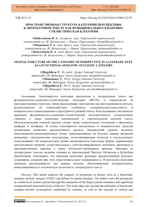 This article analyzes the category of prospectus in literary texts as a functional-semantic-stylistic category (FSSC) and defines its spatial structure. The author views the prospectus as a multi-level system realized through the interaction of the deep (content-semantic) and superficial (compositional-structural) levels of the text. The study takes into account the principles of functional-semantic-stylistic systematicity established by scholars, as well as the concept of vertical and horizontal text models. The methodological basis of the analysis also includes theoretical propositions on the phenomena of anaphora and cataphora. The article systematically describes the central and superficial means of organizing the semantics of prospective analysis. The central level includes compositional-communicative blocks, future-oriented allusions to the author’s concept, and syntactic constructions that prepare the reader for the subsequent narrative. At the superficial level, verb forms expressing prospective meaning, nouns with substantivized meaning, temporal and spatial adverbs, and logically aspiring tenses are analyzed. Examples from literary texts, including excerpts from works by Chingiz Aitmatov and Kubatbek Dzhsubaliev, demonstrate that projection serves the function of anticipating future content while maintaining narrative continuity. Consequently, the category of projection is viewed as an important system that ensures the cognitive, communicative, and aesthetic integrity of a literary text.