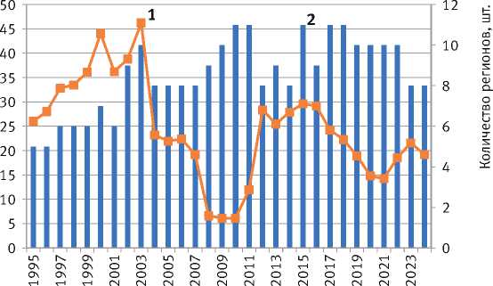 Рис. 1. Динамика площадей очагов звёздчатого пилильщика-ткача (1) и количества регионов с очагами в России (2)