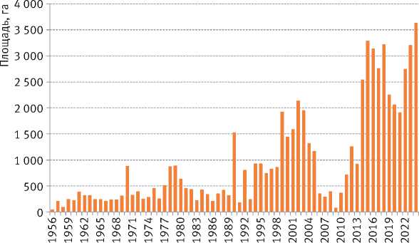 На территории Оренбургской обл. очаги звёздчатого пилильщика-ткача регистрировались с 1950-х гг. Впервые очаг был выявлен в 1956 г. на площади 50 га [6]. За период наблюдений до 2013 г. средняя ежегодная площадь очагов составляла 658 га. В 2013–2024 гг. этот показатель увеличился более чем в 4 раза (2 800 га). Динамика площадей очагов приведена на рис. 2 (данные за 1956–1995 гг. взяты из литературных источников [6]).