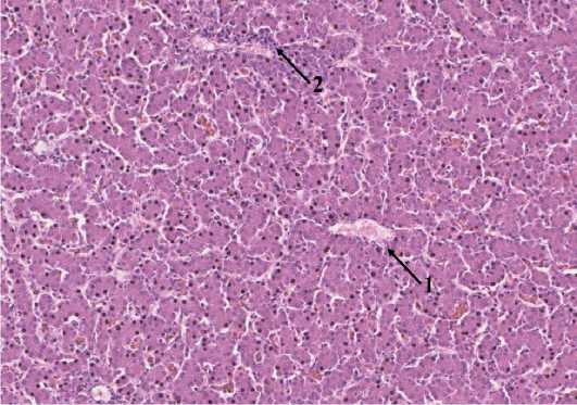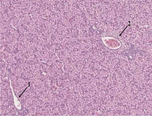 Рисунок 1 — Паренхима печени 1-суточного цыпленка-бройлера перед разделением на группы: 1 - центральная вена; 2 - ветвь портальной вены в составе портального такта Гематоксилин+эозин, х100.