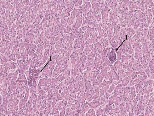 Рисунок 2 — Паренхима печени 7-суточного цыпленка-бройлера 1 группы: 1 - очаги экстрамедуллярного кроветворения. Гематоксилин+эозин, х100.