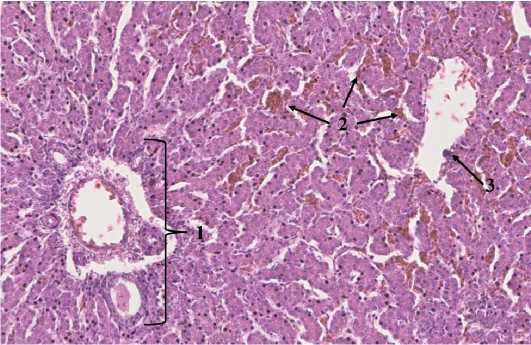 Рисунок 4 — Паренхима печени 14-суточного цыпленка-бройлера из группы 3 (энрофлоксацин); полнокровие синусоид в центральных отделах дольки (справа): 1 – портальный тракт;