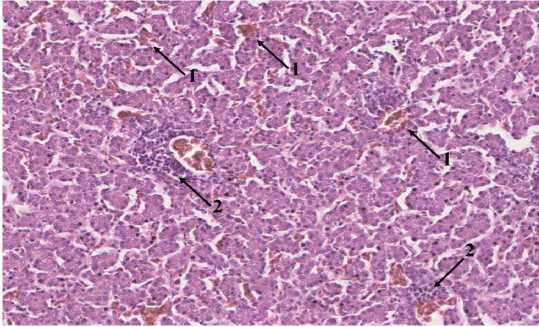 Рисунок 5 — Паренхима печени 14-суточного цыплёнка-бройлера из группы 4 (энрофлоксацин + пробиотик); умеренное полнокровие синусоид: 1 – небольшие скопления эритроцитов в синусоидах; 2 - очаги экстрамедуллярного кроветворения. Гематоксилин+эозин, ^100
