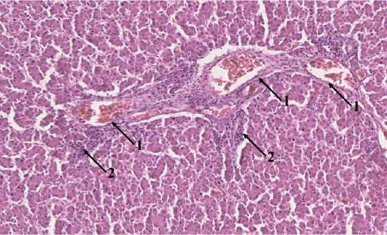 Рисунок 6 — Паренхима печени 21-суточного цыплёнка-бройлера 3 группы; незначительная перипортальная лимфоидная инфильтрация: 1 – вены портального тракта; 2 – периваскулярные лимфоидные скопления. Гематоксилин+эозин, *100