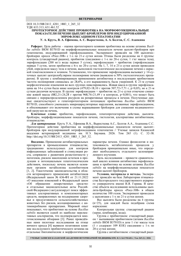 Цель работы – оценка протекторного влияния пробиотика на основе штамма Bacillus subtilis ВКМ В3701D на морфофункциональные показатели печени цыплят-бройлеров при гепатопатии, индуцированной энрофлоксацином. Эксперимент проведён на 100 цыплятахбройлерах кросса «Росс-308» с 1‑х по 21‑е сутки жизни. Птицы были разделены на 4 группы: контроль (стандартный рацион), пробиотик (ежедневно с 1‑х по 20‑е сутки, 1 г/кг массы тела), энрофлоксацин (200 мг/л воды первые 5 суток), энрофлоксацин + пробиотик (энрофлоксацин первые 5 суток, затем пробиотик с 6‑х по 20‑е сутки. На 1, 7, 14 и 21‑е сутки жизни проводили убой, определяли массу тела и печени, выполняли гистологическое исследование печени с окраской гематоксилином и эозином. Установлено, что применение энрофлоксацина вызывает у 14‑суточных цыплят центролобулярное полнокровие печени (выявлено в 50% гистологических препаратов). В группе с комбинированным применением антибиотика и последующим пробиотиком частота полнокровия снижалась до 28,6%, а его выраженность была умеренной. К 21‑м суткам морфологические изменения во всех группах нивелировались. Живая масса в группе энрофлоксацина на 14‑е сутки была ниже контроля (479,02±18,10 г против 507,72±7,71 г, p<0,05), но к 21‑м суткам различия исчезали. В группе энрофлоксацин + пробиотик на 21‑е сутки отмечено снижение живой массы (882,21±24,28 г против 968,74±21,49 г в контроле, p<0,001), что может быть связано с перераспределением ресурсов на репаративные процессы в печени. Полученные данные свидетельствуют о гепатопротекторном потенциале пробиотика Bacillus subtilis ВКМ В3701D, способного уменьшать микроциркуляторные нарушения, вызванные энрофлоксацином, и обосновывают его включение в схемы выращивания бройлеров для снижения медикаментозной нагрузки на печень.