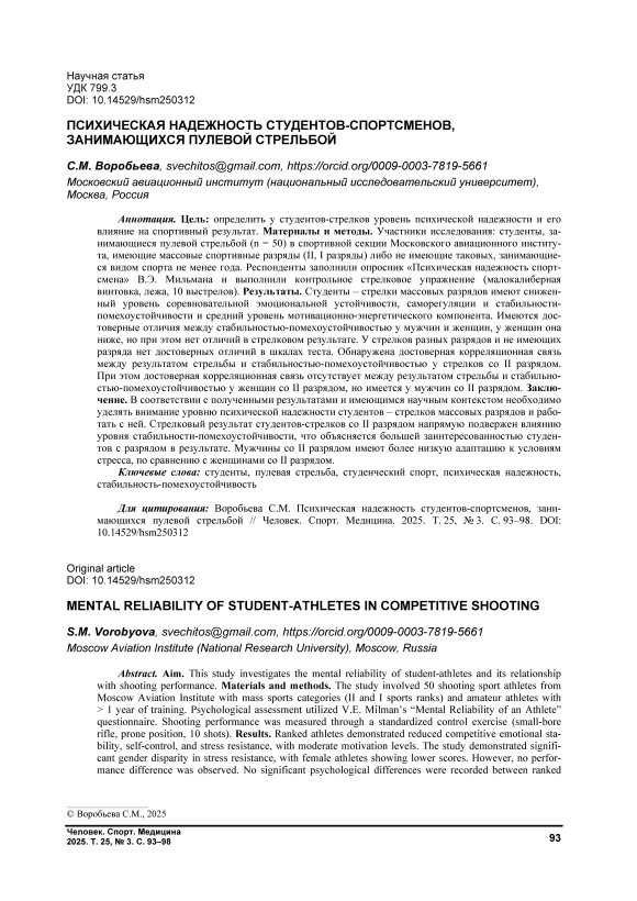 Цель: определить у студентов-стрелков уровень психической надежности и его влияние на спортивный результат. Материалы и методы. Участники исследования: студенты, занимающиеся пулевой стрельбой (n = 50) в спортивной секции Московского авиационного института, имеющие массовые спортивные разряды (II, I разряды) либо не имеющие таковых, занимающиеся видом спорта не менее года. Респонденты заполнили опросник «Психическая надежность спортсмена» В.Э. Мильмана и выполнили контрольное стрелковое упражнение (малокалиберная винтовка, лежа, 10 выстрелов). Результаты. Студенты – стрелки массовых разрядов имеют сниженный уровень соревновательной эмоциональной устойчивости, саморегуляции и стабильности-помехоустойчивости и средний уровень мотивационно-энергетического компонента. Имеются достоверные отличия между стабильностью-помехоустойчивостью у мужчин и женщин, у женщин она ниже, но при этом нет отличий в стрелковом результате. У стрелков разных разрядов и не имеющих разряда нет достоверных отличий в шкалах теста. Обнаружена достоверная корреляционная связь между результатом стрельбы и стабильностью-помехоустойчивостью у стрелков со II разрядом. При этом достоверная корреляционная связь отсутствует между результатом стрельбы и стабильностью-помехоустойчивостью у женщин со II разрядом, но имеется у мужчин со II разрядом. Заключение. В соответствии с полученными результатами и имеющимся научным контекстом необходимо уделять внимание уровню психической надежности студентов – стрелков массовых разрядов и работать с ней. Стрелковый результат студентов-стрелков со II разрядом напрямую подвержен влиянию уровня стабильности-помехоустойчивости, что объясняется большей заинтересованностью студентов с разрядом в результате. Мужчины со II разрядом имеют более низкую адаптацию к условиям стресса, по сравнению с женщинами со II разрядом.