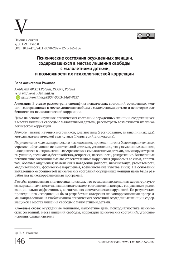 Психические состояния осужденных женщин, содержавшихся в местах лишения свободы с малолетними детьми, и возможности их психологической коррекции