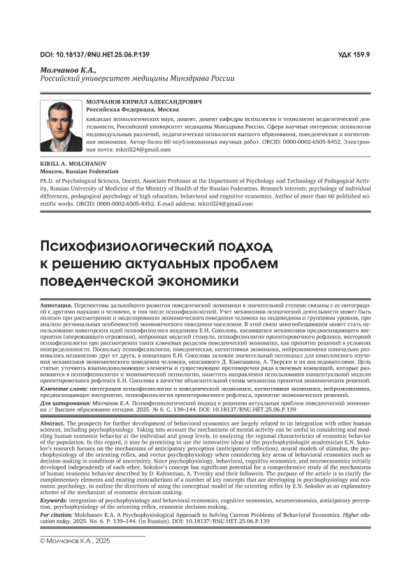 Перспективы дальнейшего развития поведенческой экономики в значительной степени связаны с ее интеграцией с другими науками о человеке, в том числе психофизиологией. Учет механизмов психической деятельности может быть полезен при рассмотрении и моделировании экономического поведения человека на индивидном и групповом уровнях, при анализе региональных особенностей экономического поведения населения. В этой связи многообещающим может стать использование новаторских идей психофизиолога академика Е.Н. Соколова, касающихся механизмов предвосхищающего восприятия (опережающего отражения), нейронных моделей стимула, психофизиологии ориентировочного рефлекса, векторной психофизиологии при рассмотрении таких ключевых разделов поведенческой экономики, как принятие решений в условиях неопределенности. Поскольку психофизиология, поведенческая, когнитивная экономика, нейроэкономика изначально развивались независимо друг от друга, в концепции Е.Н. Соколова заложен значительный потенциал для комплексного изучения механизмов экономического поведения человека, описанного Д. Канеманом, А. Тверски и их последователями. Цель статьи: уточнить взаимодополняющие элементы и существующие противоречия ряда ключевых концепций, которые развиваются в психофизиологии и экономической психологии, наметить направления использования концептуальной модели ориентировочного рефлекса Е.Н. Соколова в качестве объяснительной схемы механизма принятия экономических решений.