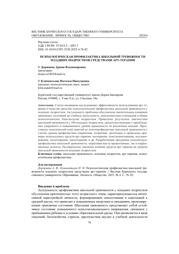 Статья посвящена исследованию эффективности использования арт-терапии в качестве средства психологической профилактики школьной тревожности у младших подростков. Актуальность проблемы обусловлена значительным влиянием тревожных состояний на учебную деятельность, межличностные отношения и общее психологическое благополучие подростков. Приведены результаты диагностики школьной тревожности у 100 младших подростков, свидетельствующие о преобладании умеренного и повышенного уровня тревожности по различным шкалам. Представлен тематический план занятий по психопрофилактике школьной тревожности с учетом уровня профилактики (первичная, вторичная, третичная) и приведены примеры используемых средств арт-терапии: изотерапии, пластилинотерапии, коллажирования, пескотерапии, маскотерапии и др. Разработанная программа способствует профилактике школьной тревожности, затрагивая как ее превентивные, так и коррекционные аспекты. Подтверждено значимое влияние средств арт-терапии на уровень школьной тревожности младших подростков.